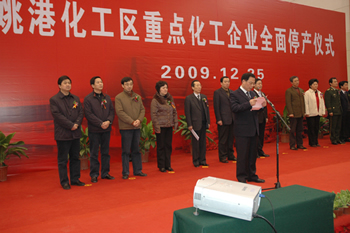 2009年12月25日下午,隨著市委副書記、市長丁大衛(wèi)按下指令按鈕,江山股份、寶靈化工兩家企業(yè)老廠區(qū)化工生產(chǎn)裝置全部停車。此前,星辰材料老廠區(qū)所有生產(chǎn)裝置和建筑物已于2008年停產(chǎn)并拆除完畢。至此,姚港化工區(qū)3家重點(diǎn)化工企業(yè)原廠區(qū)宣告全面停產(chǎn),標(biāo)志著歷時(shí)5年的姚港化工區(qū)搬遷工作基本完成,困擾周邊居民生活和企業(yè)發(fā)展的矛盾得以解決。 2005年,市委、市政府作出了姚港化工區(qū)重點(diǎn)化工企業(yè)于2010年底前搬遷入園的重要決策。五年來,市委、市政府高度重視老廠區(qū)搬遷和新廠區(qū)建設(shè)各項(xiàng)工作,并把姚港化工區(qū)重點(diǎn)化工企業(yè)搬遷列為市政府重點(diǎn)工作之一,按照“搬優(yōu)、搬強(qiáng)、搬環(huán)保、搬安全”的總體要求,精心組織、扎實(shí)推進(jìn)。在市相關(guān)部門、崇川區(qū)政府、開發(fā)區(qū)管委會(huì)、產(chǎn)控集團(tuán)和各搬遷企業(yè)共同努力下,搬遷工作有序推進(jìn),搬遷任務(wù)提前完成。 搬遷不是簡單復(fù)制。截至目前,市政府以產(chǎn)控集團(tuán)作為運(yùn)作平臺(tái),支持姚港化工區(qū)三家企業(yè)搬遷,共撥付補(bǔ)償資金6.25億元,帶動(dòng)企業(yè)完成投資43億元。政府的支持有力加快了企業(yè)搬遷改造步伐,促進(jìn)了企業(yè)技術(shù)、裝備、管理水平大提升,為企業(yè)調(diào)整結(jié)構(gòu)、做大做強(qiáng)奠定了基礎(chǔ),為新一輪加快發(fā)展積蓄了后勁。為落實(shí)環(huán)保、安全要求,三家企業(yè)新廠區(qū)用于環(huán)保和安全設(shè)施建設(shè)的投入已達(dá)5.1億元,是搬遷前總投入的3倍多。通過搬遷,淘汰了落后產(chǎn)能,采用國內(nèi)先進(jìn)的生產(chǎn)工藝和安全環(huán)保技術(shù),三廢處理實(shí)現(xiàn)了節(jié)能減排新提高。 副市長徐輝主持停產(chǎn)儀式,市有關(guān)部門負(fù)責(zé)人出席并參觀了搬遷企業(yè)新廠區(qū)。
