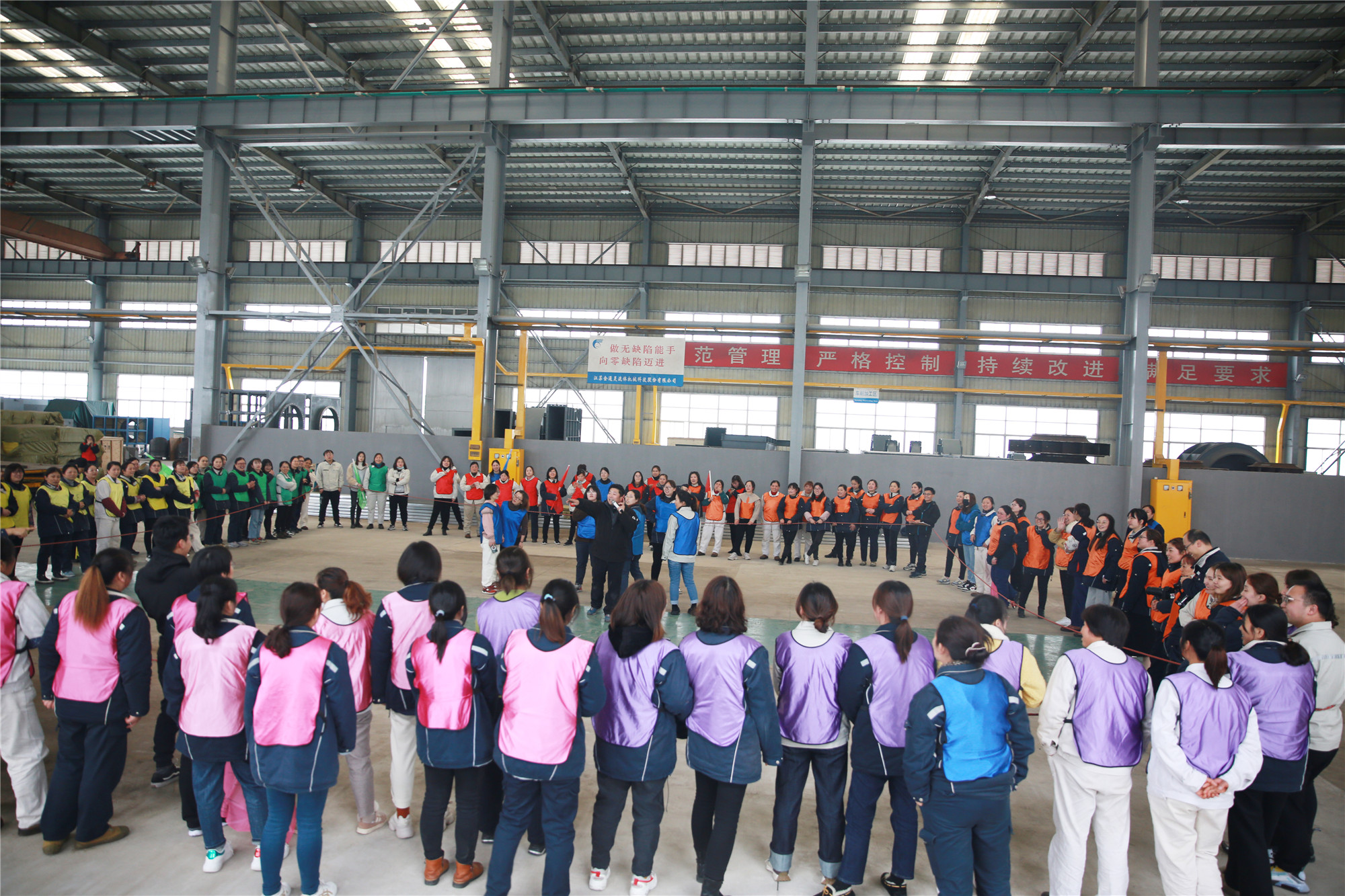 3月8日下午, 一百多名女職工歡聚2號(hào)車間,在教練的帶領(lǐng)下,分成了10個(gè)小組,按照要求分別設(shè)計(jì)了自己隊(duì)的隊(duì)名、隊(duì)徽、口號(hào)、隊(duì)歌,并依次展示了團(tuán)隊(duì)風(fēng)采。在充滿樂趣的熱身小游戲后,便開始了“坦克大戰(zhàn)”、“環(huán)游世界球”、“動(dòng)力繩圈”等團(tuán)隊(duì)拓展項(xiàng)目。在彼此信任、相互溝通、集體協(xié)作的氛圍中,各小組成功完成了此次拓展任務(wù)。參加此次活動(dòng)的廣大女職工們有長(zhǎng)期伏案的科員,有奮戰(zhàn)一線的工人,也有集團(tuán)中高層領(lǐng)導(dǎo),在新組建的團(tuán)隊(duì)中,大家拋開身份,融入隊(duì)伍,在隊(duì)長(zhǎng)的帶領(lǐng)下,克服困難,團(tuán)結(jié)一心,共同為隊(duì)伍加分增光。 此次拓展活動(dòng),既緩解了女職工們工作的疲憊和壓力,又增進(jìn)了同事間的友誼,增強(qiáng)了團(tuán)隊(duì)凝聚力,大家在娛樂中感受到團(tuán)隊(duì)的力量。集團(tuán)黨委副書記、工會(huì)主席李建兵給女工們送上節(jié)日的祝福,他表示,廣大女職工們?cè)诖舜位顒?dòng)中充分展示了巾幗風(fēng)采,彰顯出金通靈女工隊(duì)伍的魅力,在今后的工作中,大家要時(shí)刻握緊手中的“動(dòng)力繩”,勁往一處使,力往一處用,跟著團(tuán)隊(duì)的步調(diào),以奮發(fā)昂揚(yáng)的姿態(tài)繼續(xù)前行! |