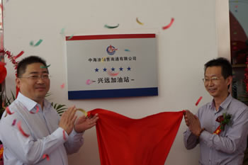 中海油銷售江蘇有限公司副總經(jīng)理陳東昱和南通產(chǎn)業(yè)控股有限公司集團(tuán)副總經(jīng)理沈百安為興遠(yuǎn)加油站揭牌