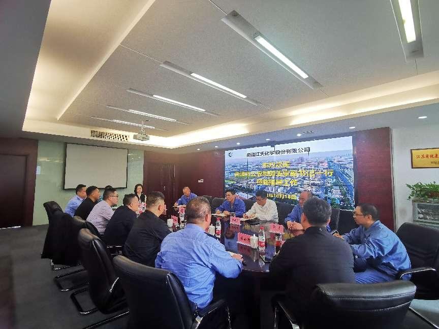 為全方位深度擰緊安全環(huán)保責任鏈條,進一步提高企業(yè)環(huán)保本質(zhì)化治理能力和水平,10月18日上午,南通市公安局黨委副書記、副局長郭玉家一行來到南通江天化學股份有限公司開展工作走訪調(diào)研。江天化學黨支部書記、副總經(jīng)理張永鋒、黨支部副書記、副總經(jīng)理沙曉東、支部委員、副總經(jīng)理任建軍等陪同調(diào)研參觀。